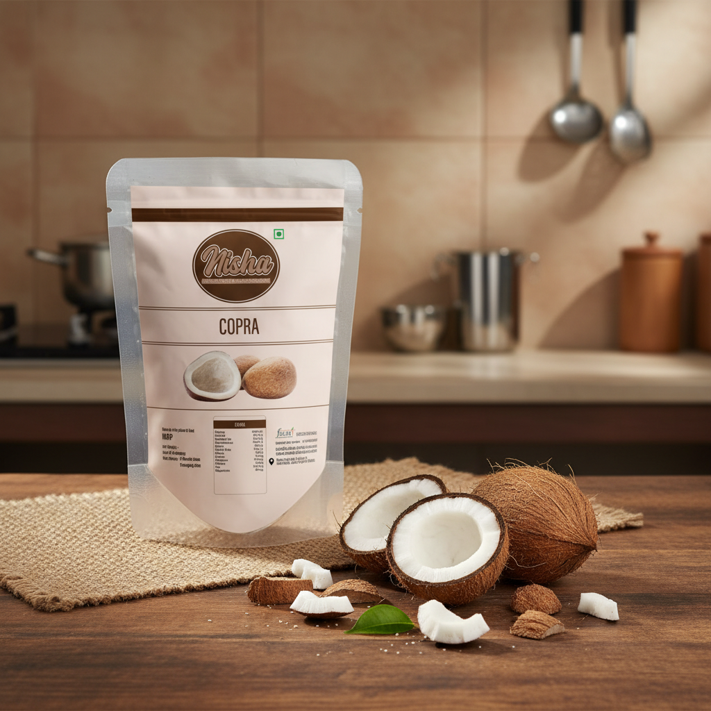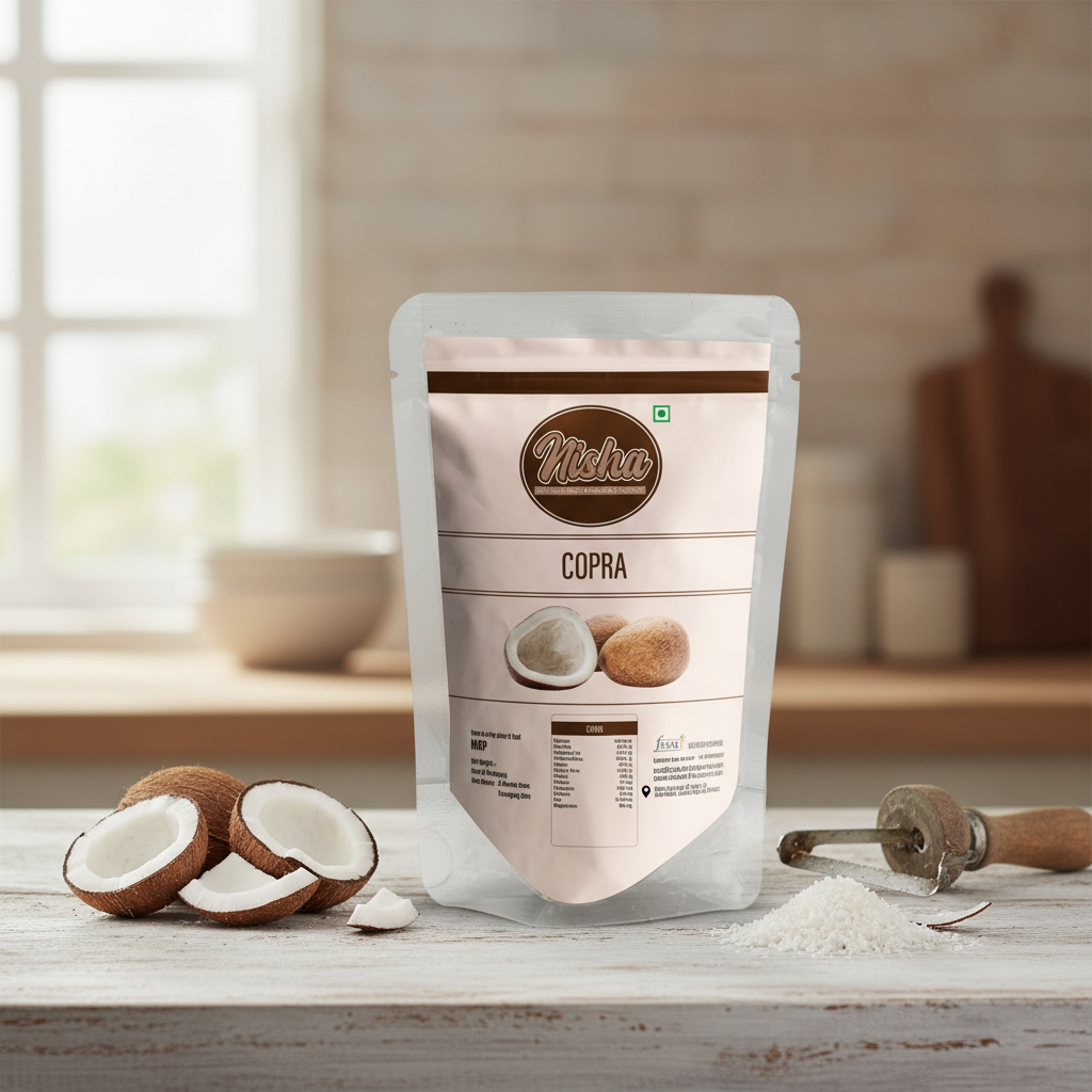 Copra, commonly known as dry coconut, is made from carefully dried mature coconuts and is widely used in Indian kitchens for its rich taste and long shelf life. Nisha Dry Fruit Spices’ Copra is hygienically processed and packed to ensure purity, freshness, and authentic flavour.