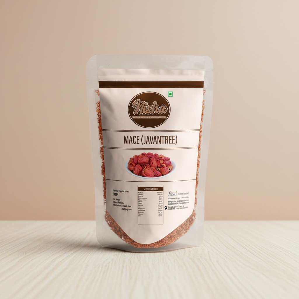 Mace, known as Javantree, is the lacy outer covering of nutmeg and is prized for its refined aroma and subtle flavour. More delicate than nutmeg, it adds depth without overpowering. Nisha Dry Fruit Spices’ Mace is carefully sourced and hygienically packed to preserve its natural fragrance and colour.