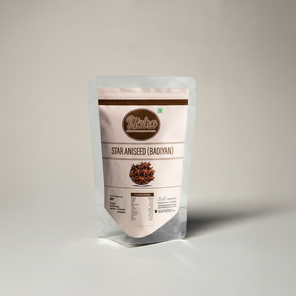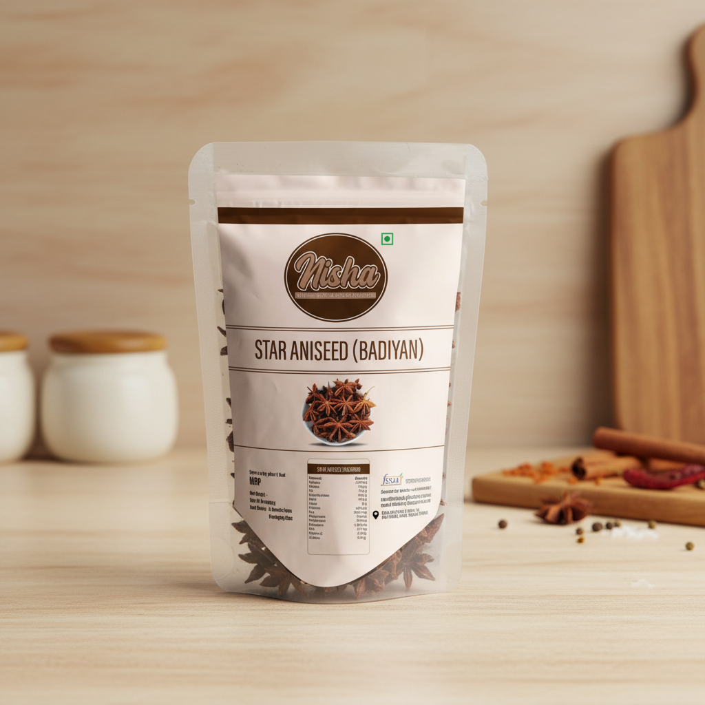 Star Aniseed, commonly known as Badiyan, is a visually striking whole spice valued for its strong aroma and sweet-spicy flavour. Widely used in Indian and Asian cuisines, Nisha Dry Fruit Spices’ Star Aniseed is carefully sourced and hygienically packed to retain its natural oils and fragrance.